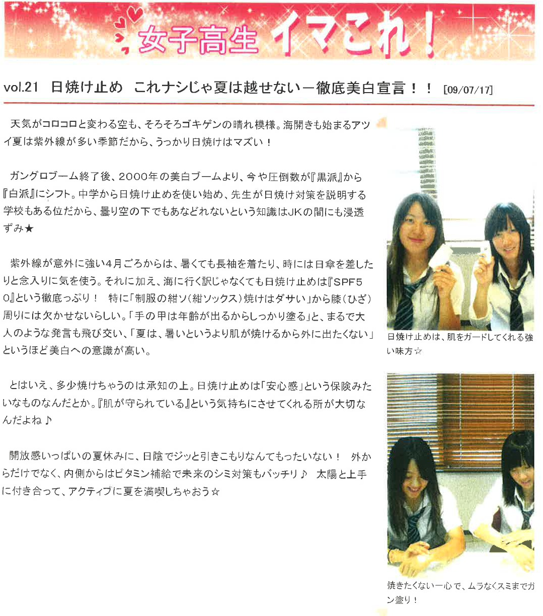 Vol.21(2009.07.17)日焼け止め これナシじゃ夏は越せないー徹底美白宣言!!
