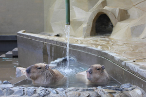 飼育場所の一角に露天風呂がオープンし、のんびり2匹がお湯につかって、気持ちよさそうな癒される風景をご覧ください♪