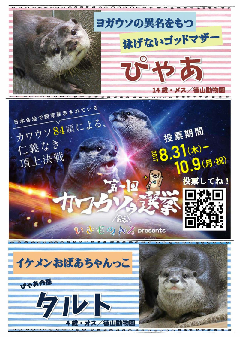 ■第1回かわうそ総選挙に、しゅうニャン市立徳山動物園から「ぴゃあ」と「タルト」がエントリーしています!2頭に投票お願いします!