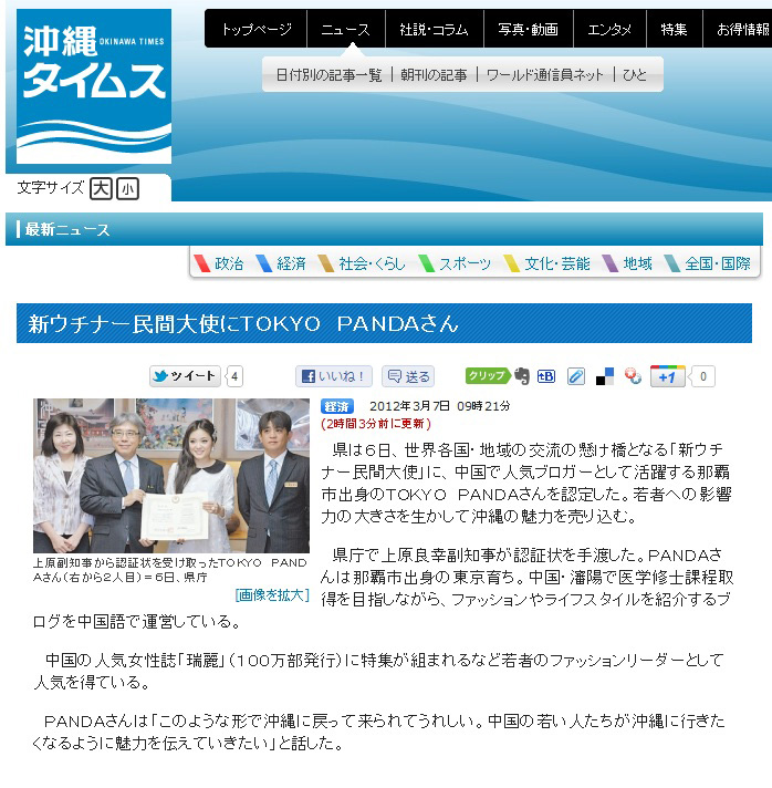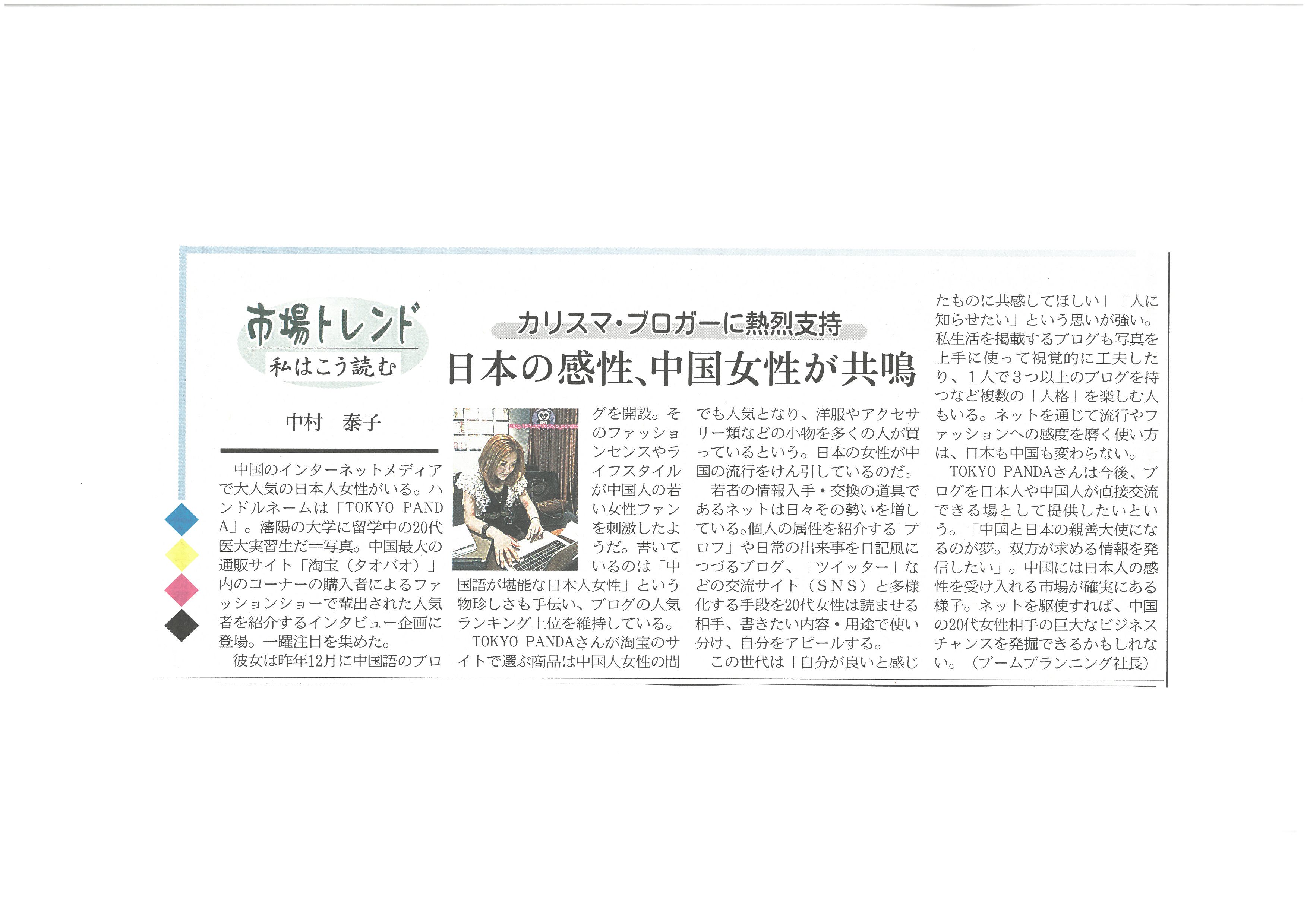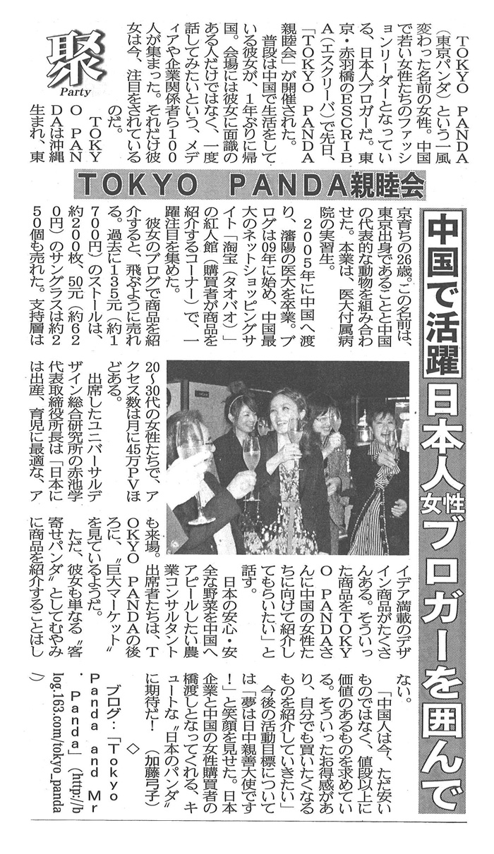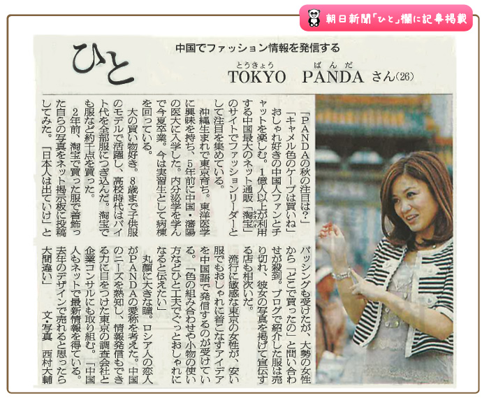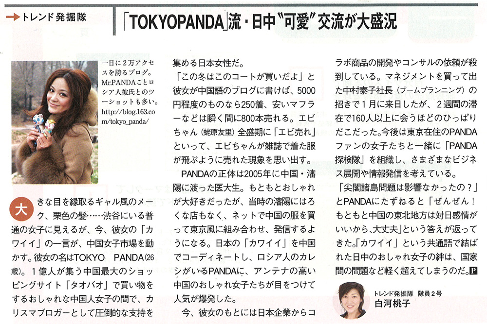 その中で、流行情報、中国人女性の気持ち、“リアル中国”を紹介できます。 また、一児の母となった今、女性として、母として、妻として、中国人へ、日本の情報をTOKYOPANDAらしくPRしていきます。